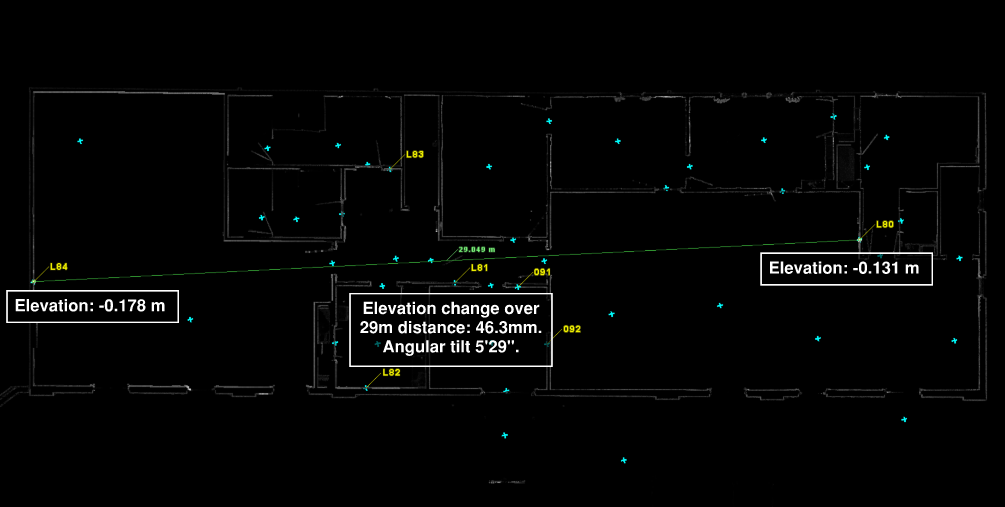 The unit is equipped with an IMU that “levels” the data. However, its 3’ accuracy does not satisfy everyone’s requirements. A tilt of 3’ means accumulating 8.7mm of error at every 10 meters. If a building is 100m long the resulting registration could be off level by 87.3mm (3.43 in). In my world that is not acceptable. So, what options do we have to ensure the registered point clouds meet a higher levelness?