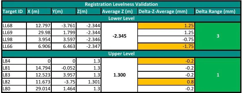 The last step of the workflow is to validate the levelness of the registration against the targets set at each level. Export all the targets to a CSV file format and follow the instructions presented at Step 6. The elevation ranges calculated in the last column should meet a higher level of accuracy.